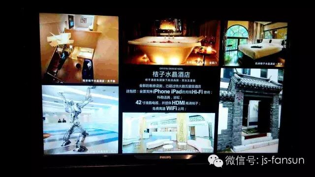 桔子水晶对于客房电视的功能,要求更高,比如:要实现洗手间吸顶嗽叭、外置音箱及电视机扬声器需要同时发声,及对高清接口有更多的需求,从而选择了飞利浦酒店商用电视机!