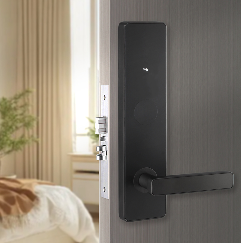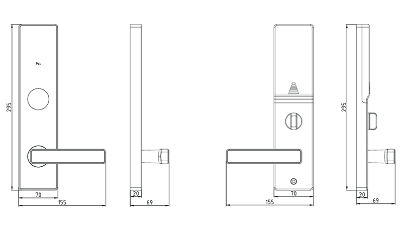 材 质:铝合金。 芯 片:采用Mifare-1芯片,密钥量2的32次方,酒店一卡通功能。 电 源:4节AA碱性电池(4.8-6V),开门次数大于10000次。 开锁记录:2000条(含机械钥匙开锁记录)。 欠压提示:当电池电量低于4.8V时开锁会有声光提示。 假锁报警:斜舌未完全进入锁门状态,门锁会假锁报警。 机械钥匙:备用,确保门锁紧急时开启门锁,可按用户定做成单开或通开。 配置锁体:6098、7098倒装锁体。 适用门厚:40mm-110mm。