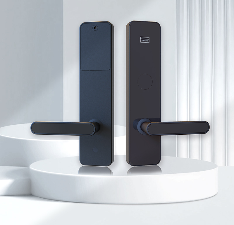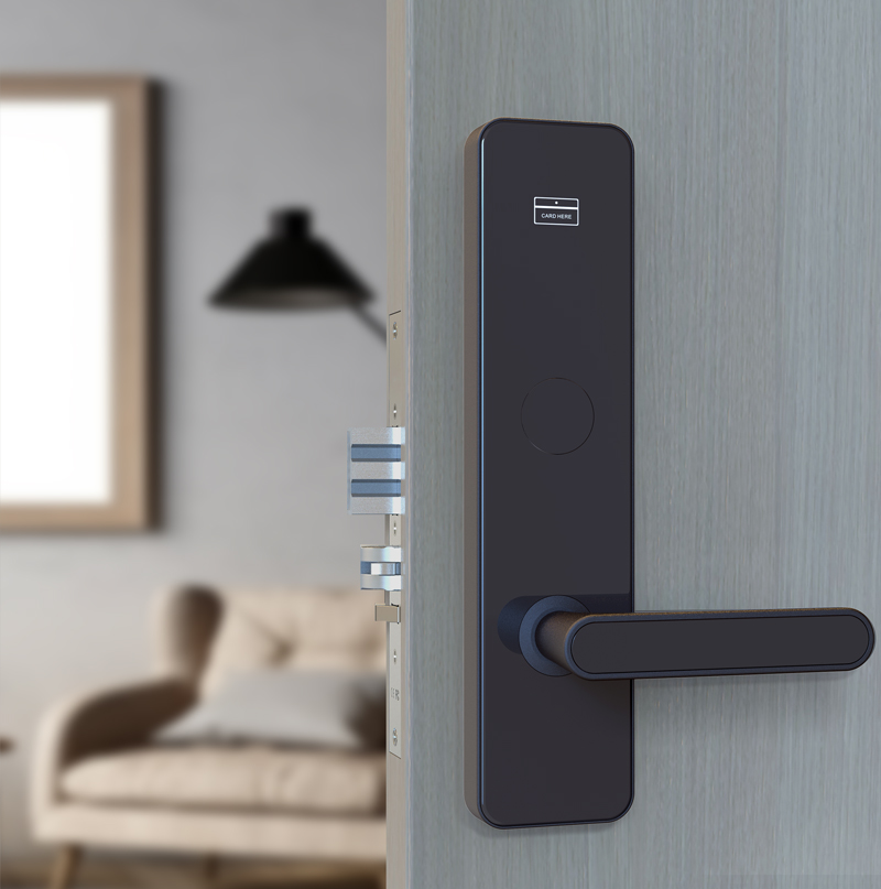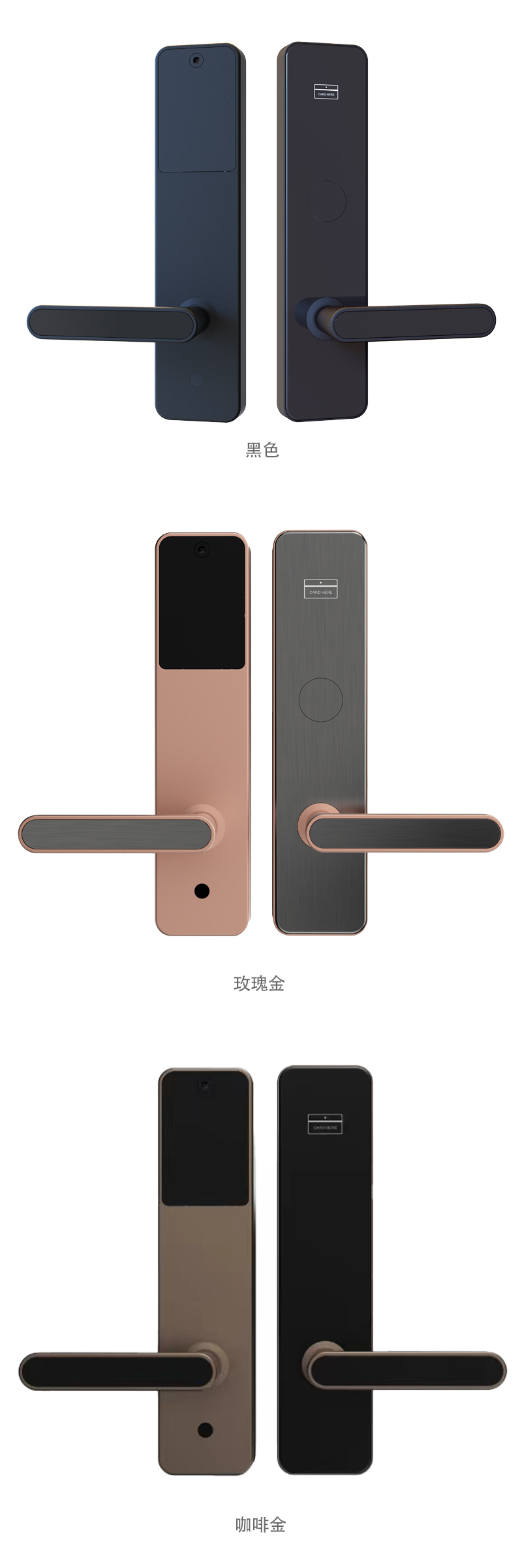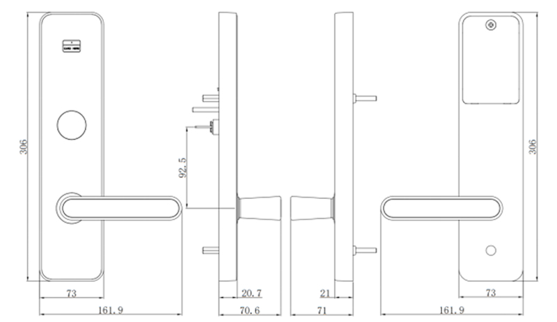 表面工艺:门锁表面喷涂工艺,耐磨,防腐性强,使用寿命更长。 材 质:采用铝合金,面板同色。 芯 片:采用Mifare-1芯片,密钥量2的32次方,酒店一卡通功能。 电 源:4节5号碱性电池,可正常开启15000次以上。 开锁记录:900条(含机械钥匙开锁记录)。 欠压提示:低于4.7V时开锁会有声光提示,此时还能开门100次左右。 假锁报警:斜舌未完全进入锁门状态,门锁会假锁报警。 机械钥匙:备用,确保门锁紧急时开启门锁,可按用户定做成单开或通开。 配置锁体:国际标准625,70锁体,锁舌及传动部件采用304不锈钢精铸。 适用门厚:38-70mm(特殊厚度需要定制)。