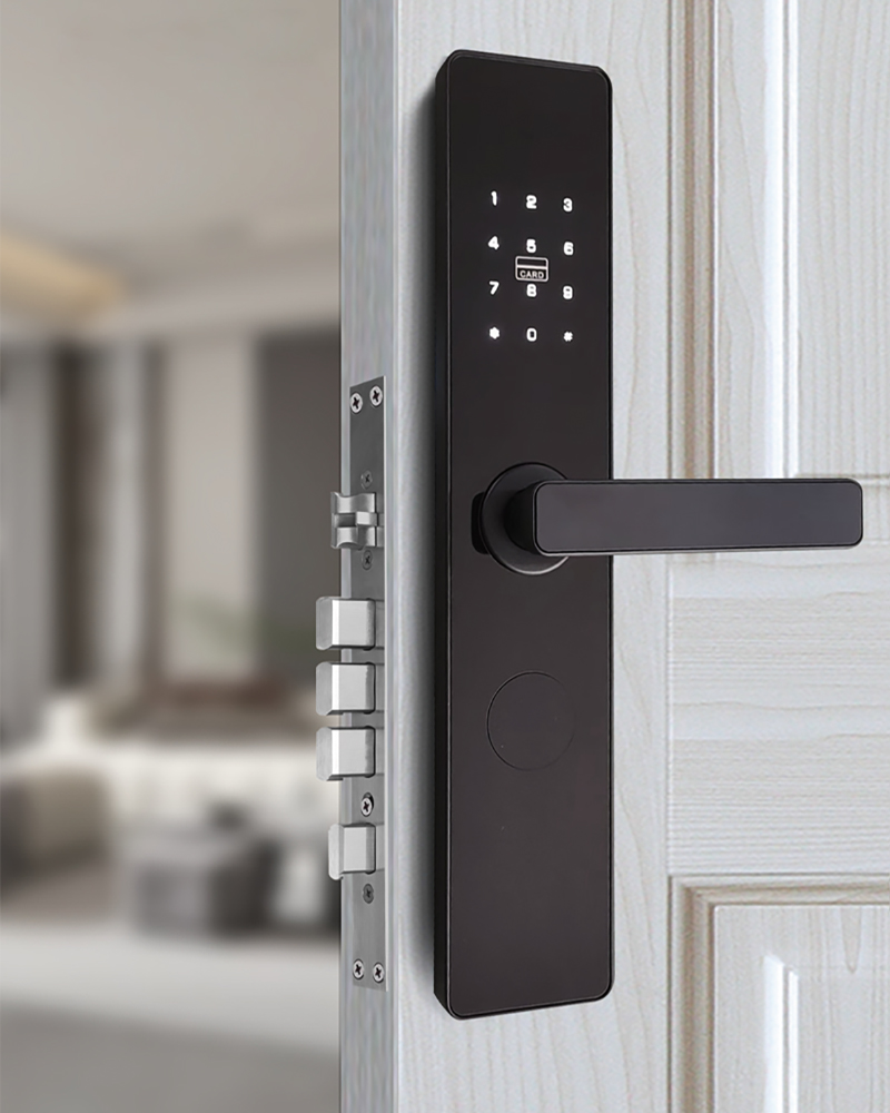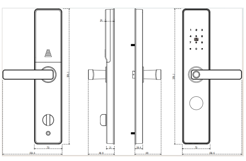 材 质:铝合金。 电 源:4节AA碱性电池(4.8-6V),开门次数大于10000次。 开锁记录:2000条(含机械钥匙开锁记录)。 欠压提示:当电池电量低于4.8V时开锁会有声光提示。 假锁报警:斜舌未完全进入锁门状态,门锁会假锁报警。 机械钥匙:备用,确保门锁紧急时开启门锁,可按用户定做成单开或通开。 密码长度:6-12位,虚位密码长度:20位。 配置锁体:6068锁体。 适用门厚:40mm-110mm。